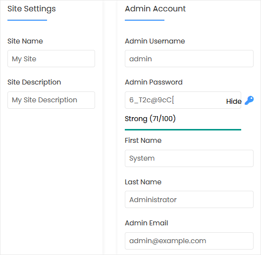 - Admin Username: Your new MovableType username (for security reasons, do not use the administrator or the admin username).
